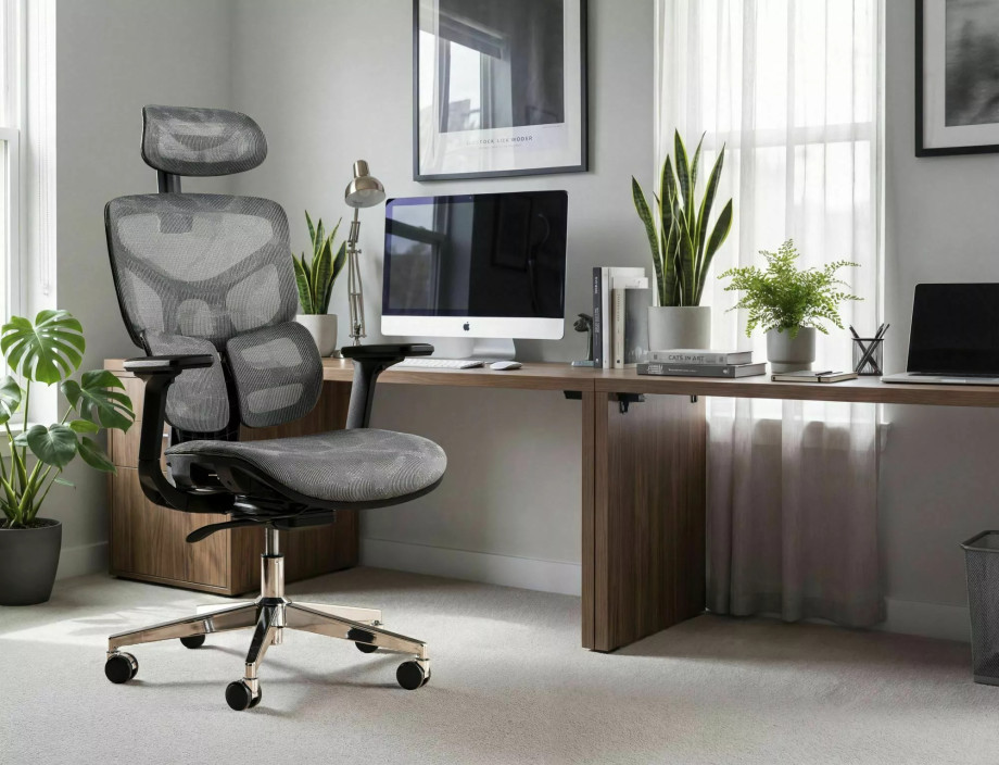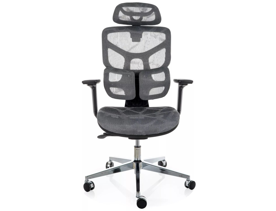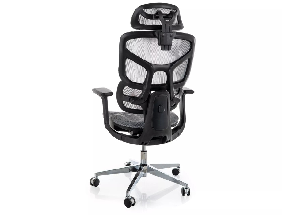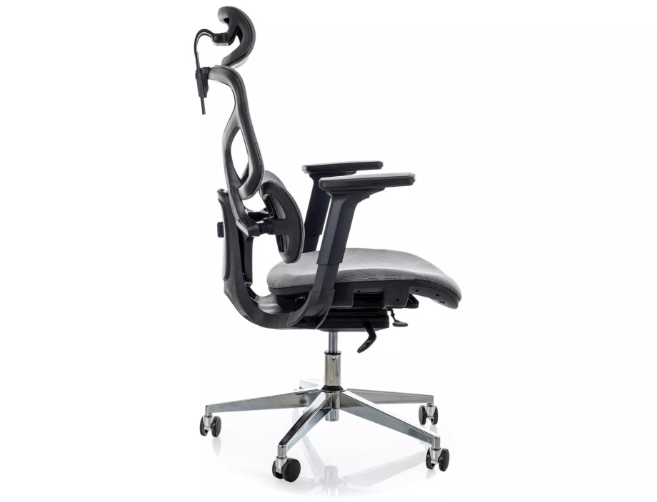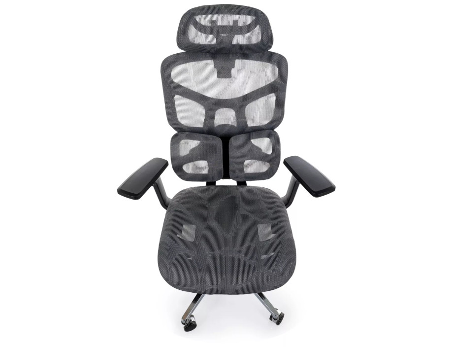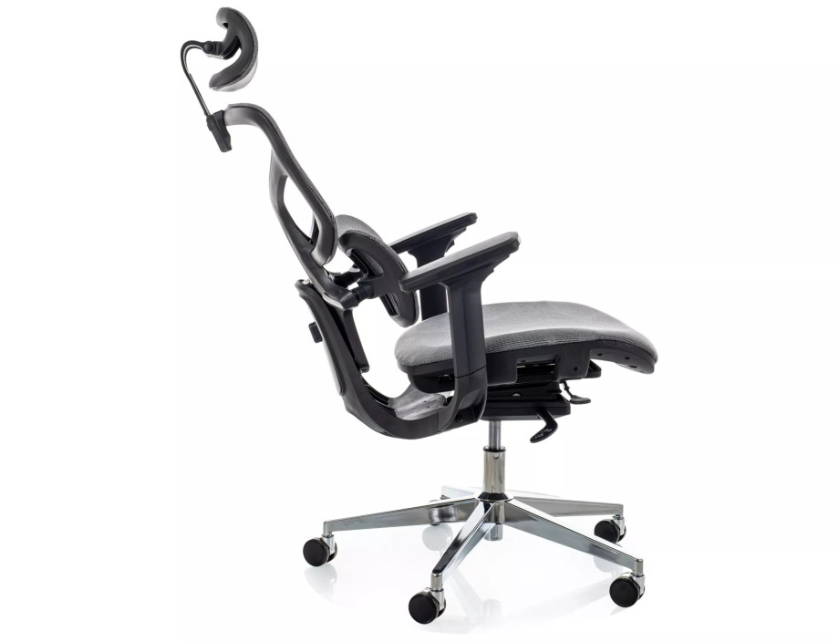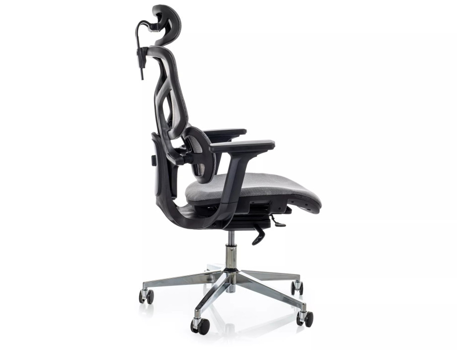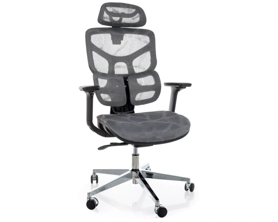 Эргономичное кресло, сетка, цвета: серый, мультиблок, регулировка: 4D подлокотники, глубина сиденья, поясничная поддержка, подголовник.
