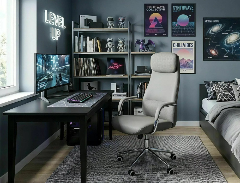 Офисное компьютерное кресло, экокожа, цвет: серый, мультиблок, регулируемый подголовник, фиксированные подлокотники.