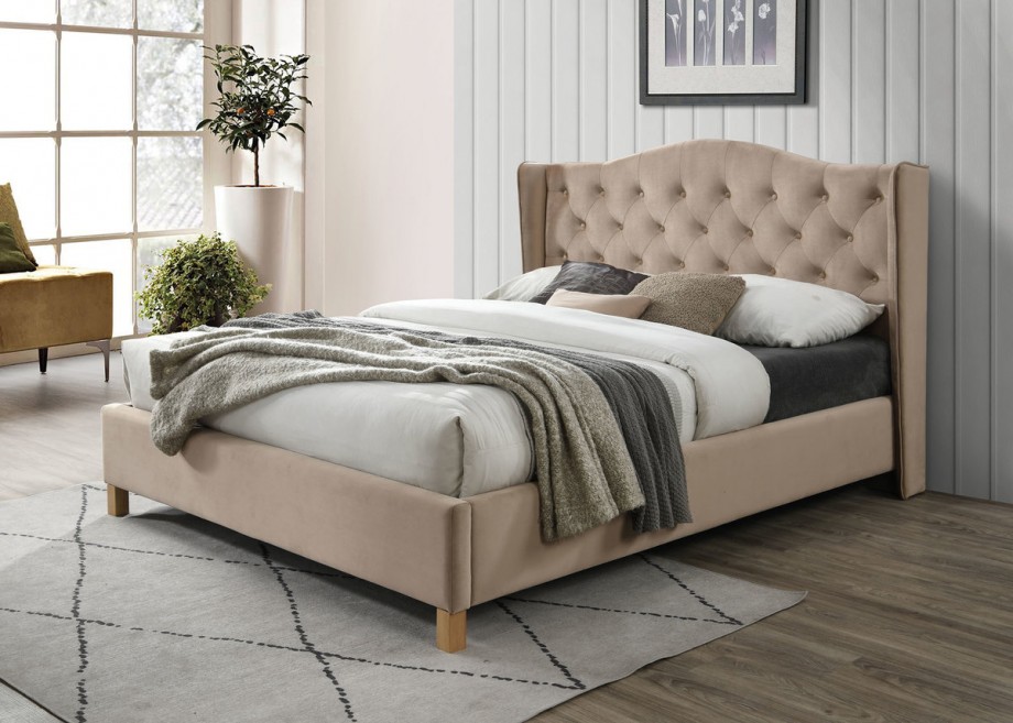 Кровать ASPEN Velvet обита высококачественным материалом, устойчивым к повреждениям и загрязнениям - бархатом. Мебель имеет интересный, привлекающий внимание, высокий подголовник с модной стежкой. Бежевый цвет вне времени, что делает его подходящим для многих стилей. Кровать отделана массивными дубовыми ножками. Бежевая кровать — идеальное предложение для любой спальни в стиле гламур, модерн и бохо.