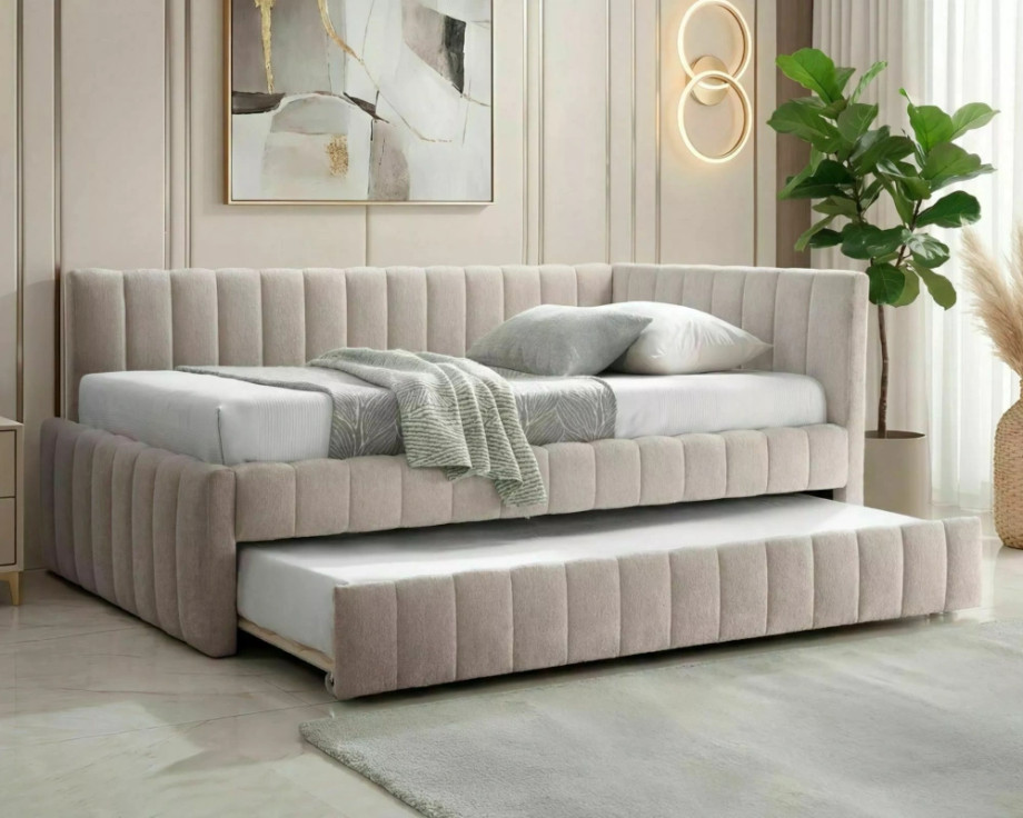 Кровать с дополнительным спальным местом, ткань Raven, цвет: 24 бежевый. Деревянный рейковый каркас в комплекте. Размер матраса: 120x200 см, дополнительное спальное место: макс. 120x200x18 см (цена без матрасов). Универсальное угловое положение слева/справа. Размеры кровати: