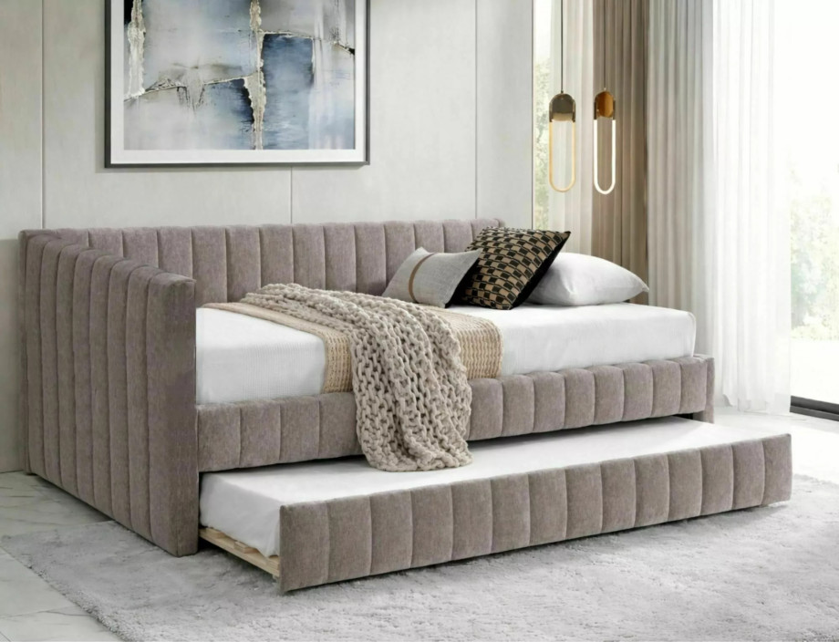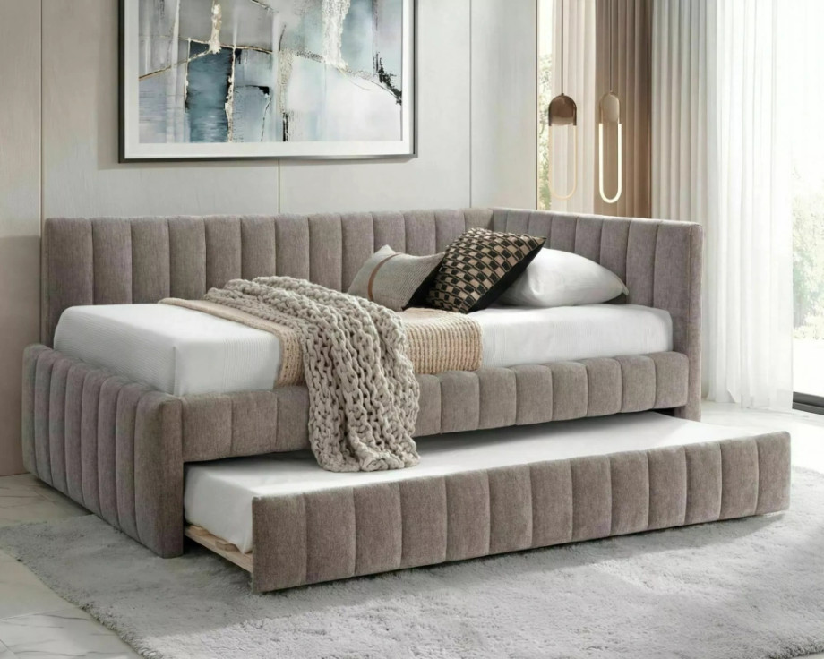 Кровать с дополнительным спальным местом, ткань Raven, цвет: 30 темно-бежевый. Деревянный рейковый каркас в комплекте. Размер матраса: 120x200 см, дополнительное спальное место: макс. 120x200x18 см (цена без матрасов). Универсальное угловое положение слева/справа. Размеры кровати: