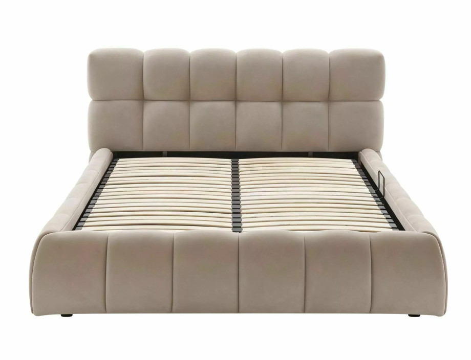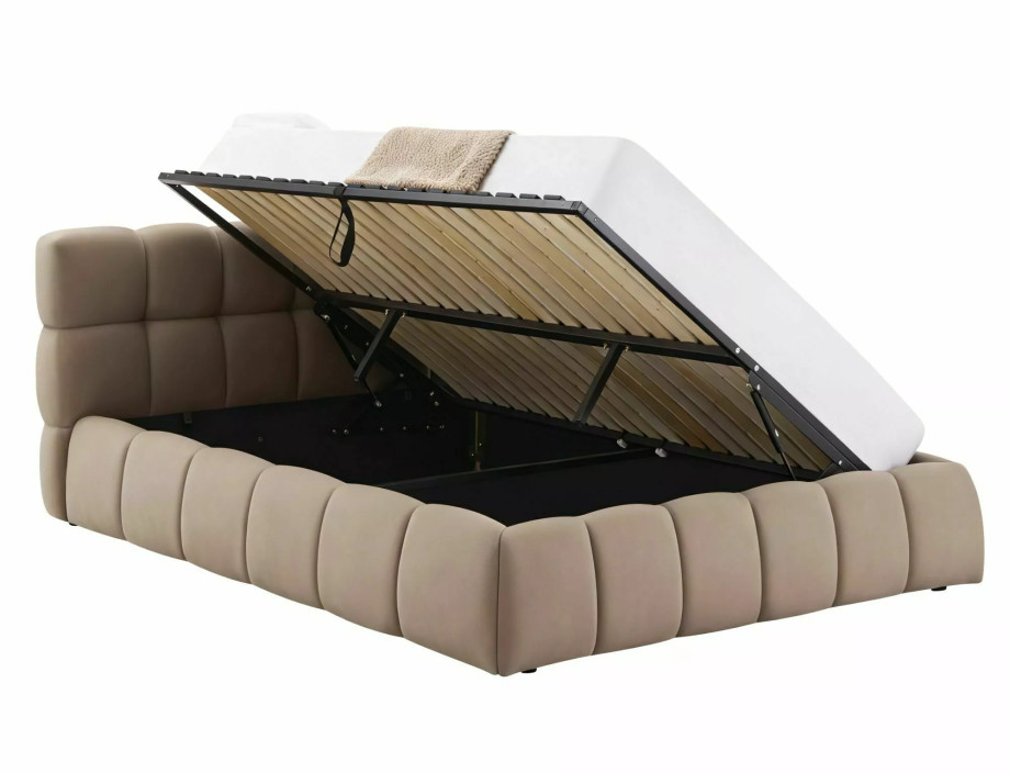 Кровать с местом хранения, бархатная ткань Bluvel, цвет: 40 темно-бежевый. Деревянный рейковый каркас в комплекте. Размер матраса: 140x200 см (цена без матрасов). Боковой каркас - универсальная сборка, открывающиеся слева/справа боковины, газовые подъемники. Размеры кровати: