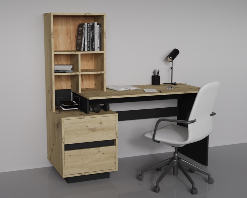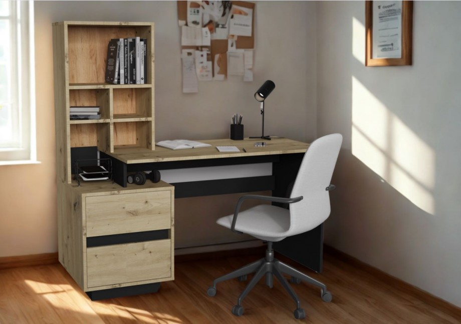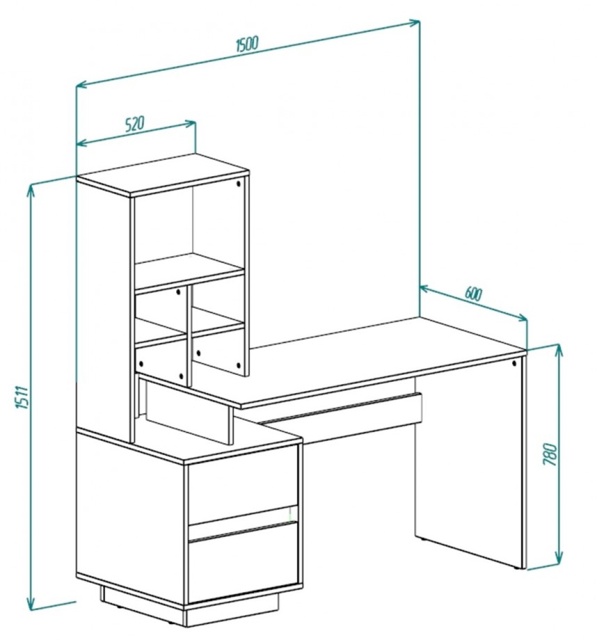 Надстройка оснащена двумя открытыми полками для книг и документов, а под столешницей расположена тумба с двумя ящиками на полновыдвижных направляющих: они двигаются плавно, не заедают и выдерживают ежедневную интенсивную нагрузку. Ламинированная поверхность столешницы устойчива к царапинам, горячим чашкам и легко очищается влажной салфеткой.