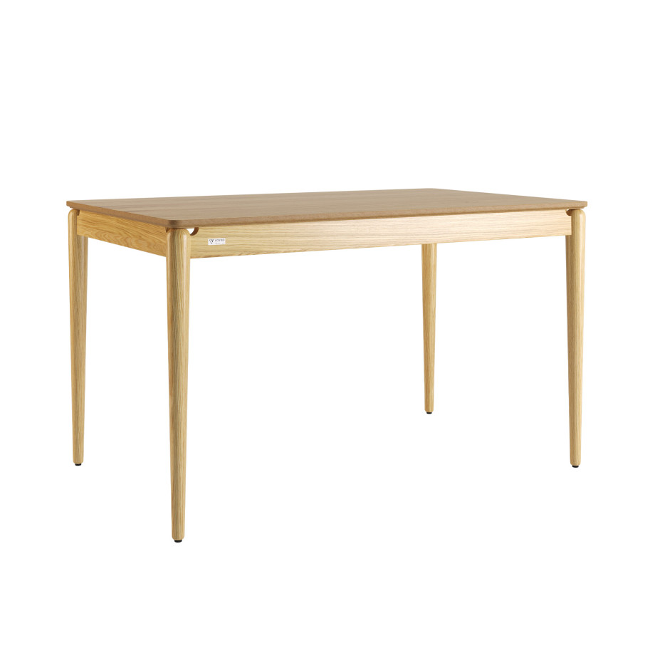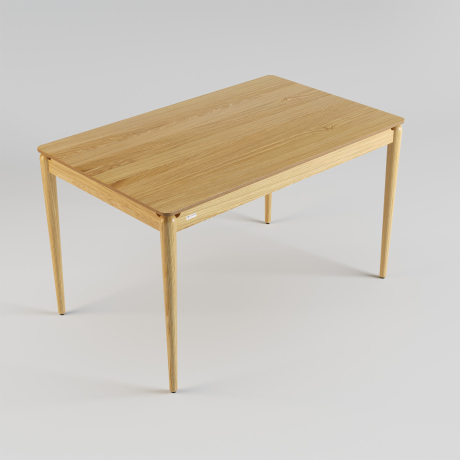Современный обеденный стол с элегантным дизайном, сочетающим натуральную эстетику и практичность. Каркас изготовлен из массива дуба, что обеспечивает надежную устойчивость и визуальную легкость. Столешница выполнена из МДФ, покрытого шпоном дуба, что подчеркивает природную текстуру дерева и придает теплоту интерьеру.