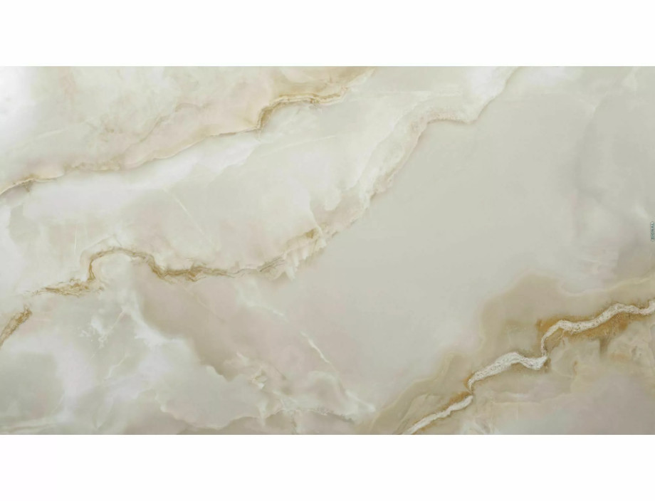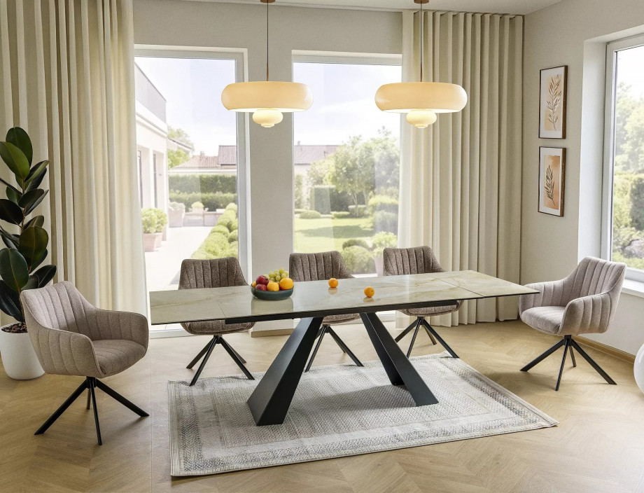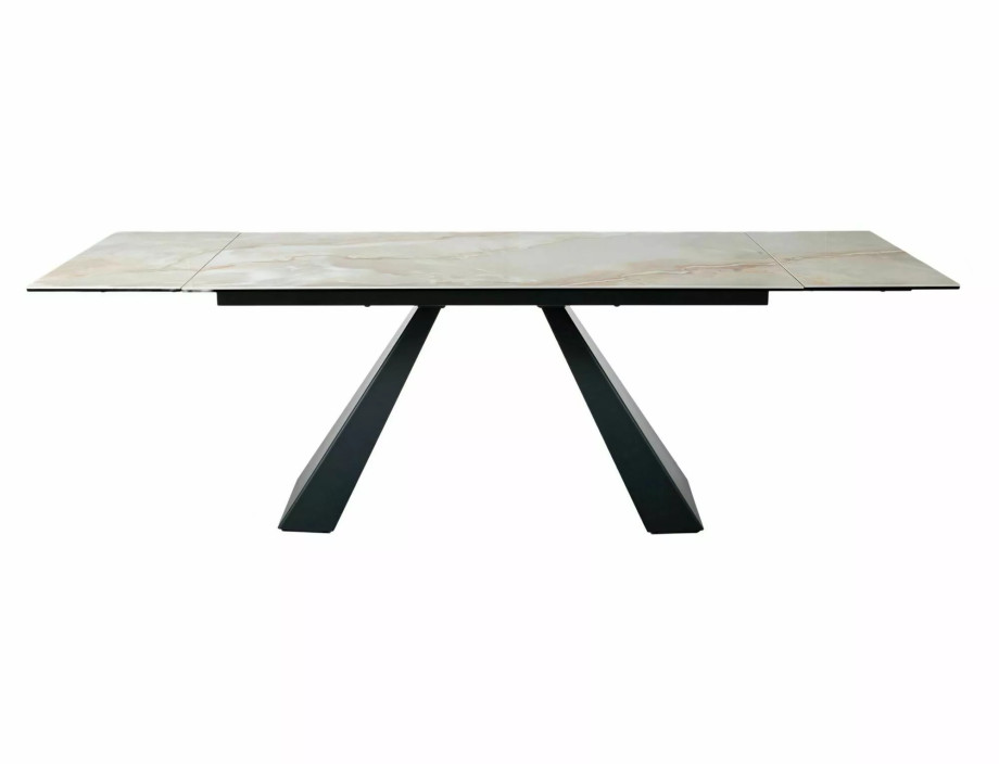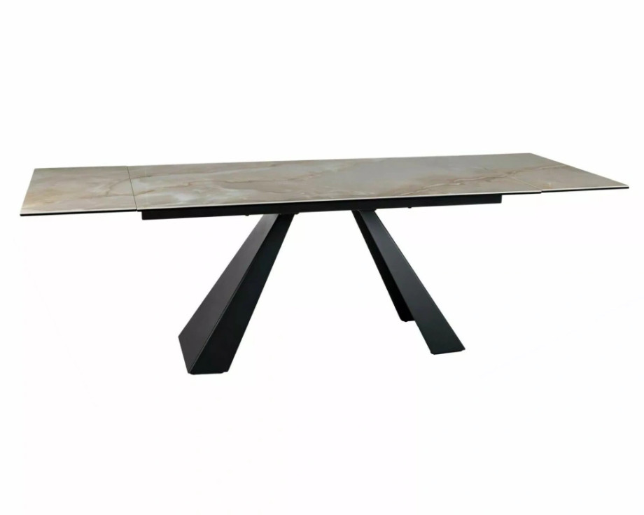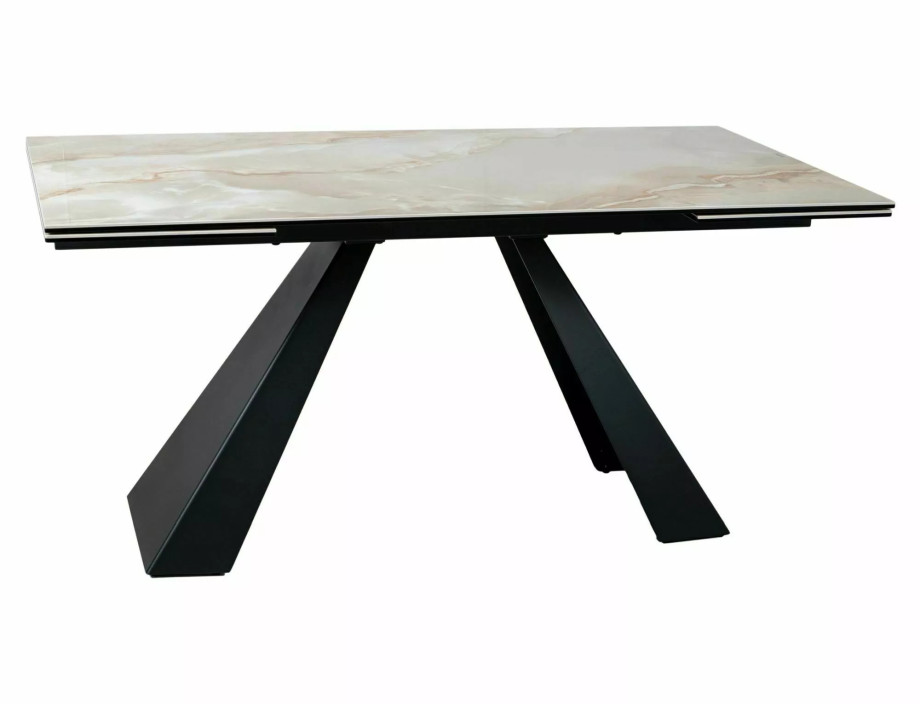 Раскладной стол, столешница: закаленное стекло + керамика Onice Oro, каркас: металл, цвет: глянцевый бежевый/матовый черный.