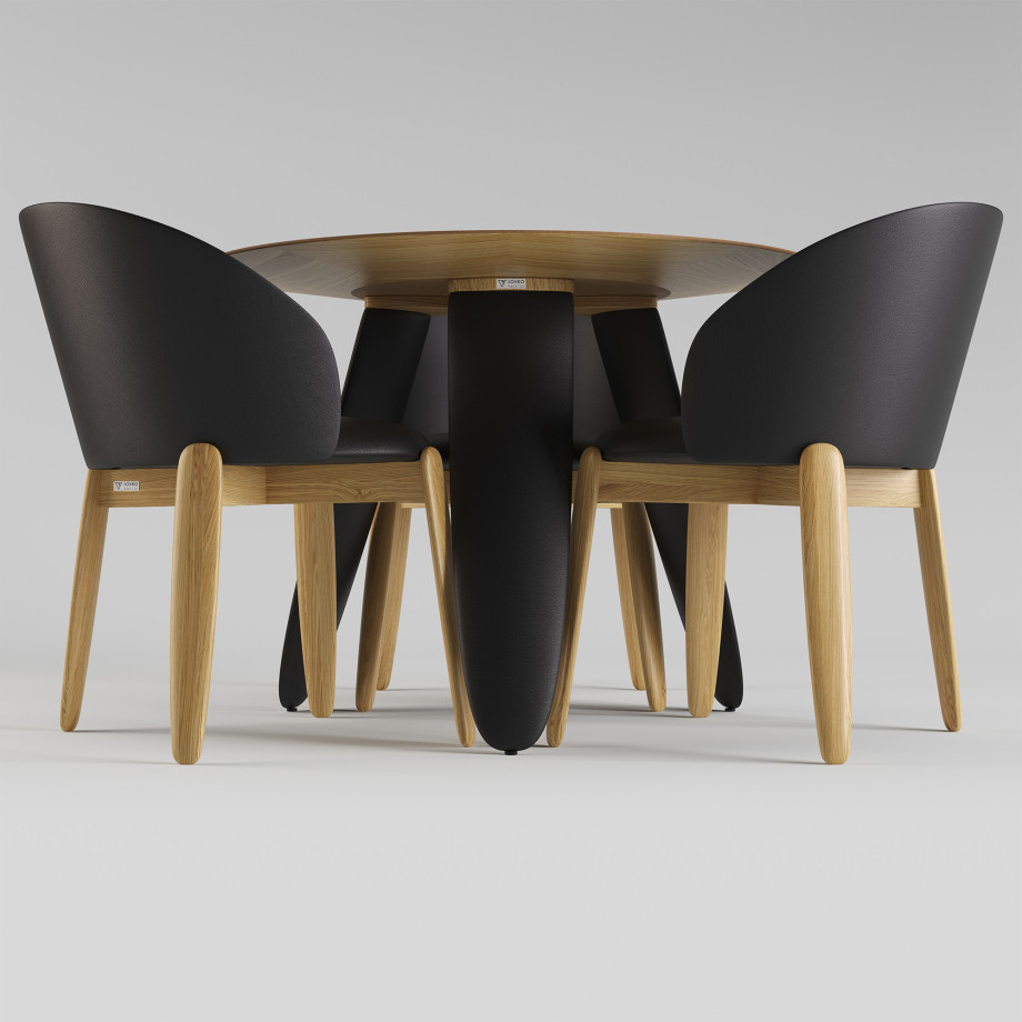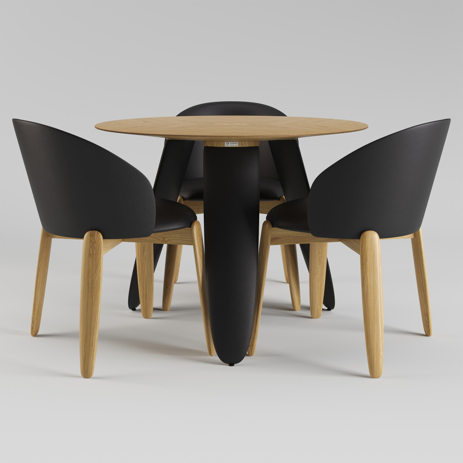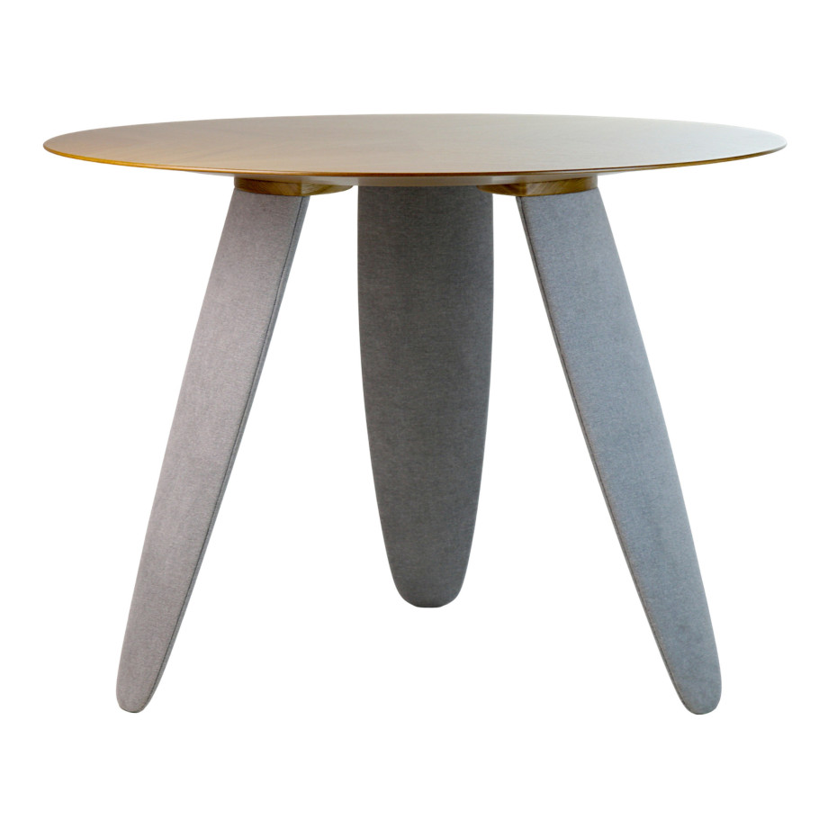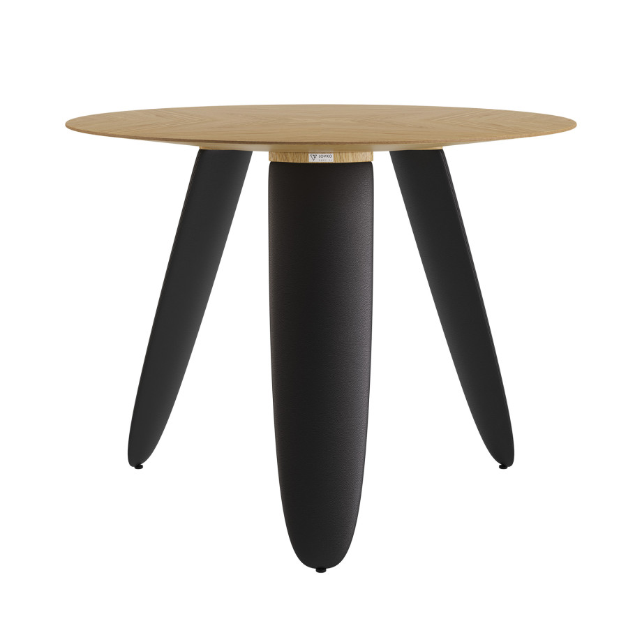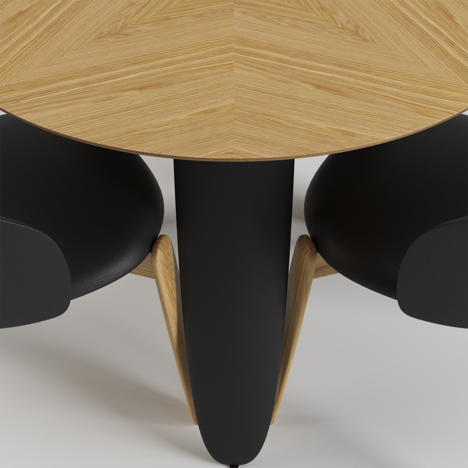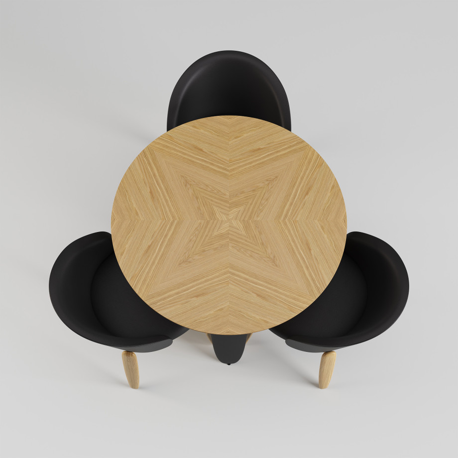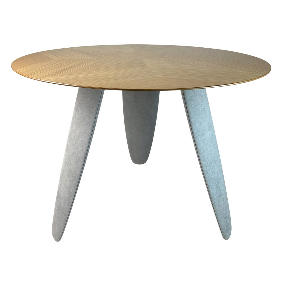 Обеденный стол — это современный акцент интерьера, который сочетает естественность дерева и нежность текстиля. Круглая столешница диаметром изготовлена из и облицована , выложенным в технике — сложного декоративного набора шпона, который образует уникальный рисунок, играющий на свету и добавляющий объема.
