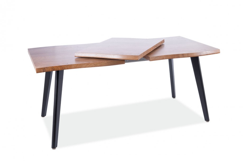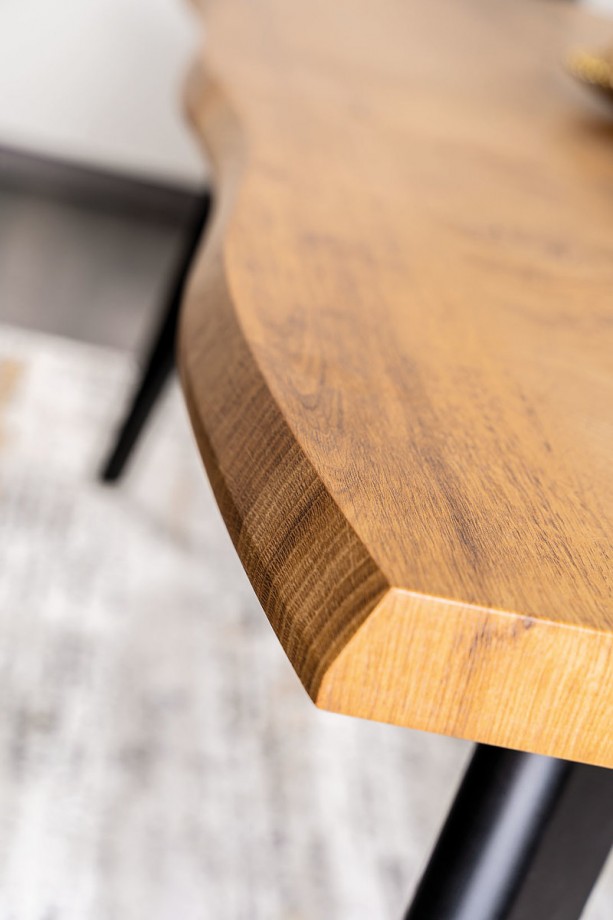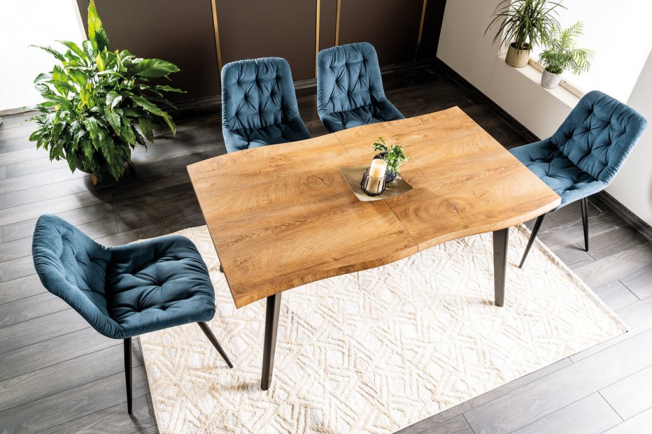Раздвижной стол Fresno — оригинальное предложение для обустройства столовой и гостиной практически в любом стиле. Необычная, слегка волнистая форма краев столешницы выгодно отличает ее от других моделей. Его универсальный дубовый цвет согреет интерьер, а имитация дерева на столешнице придаст специфический характер. Черные металлические ножки делают весь образ элегантным и стильным. В сочетании со стульями из вельветовой ткани, например Praga Corduroy, он создаст уникальную композицию, привлекающую внимание.