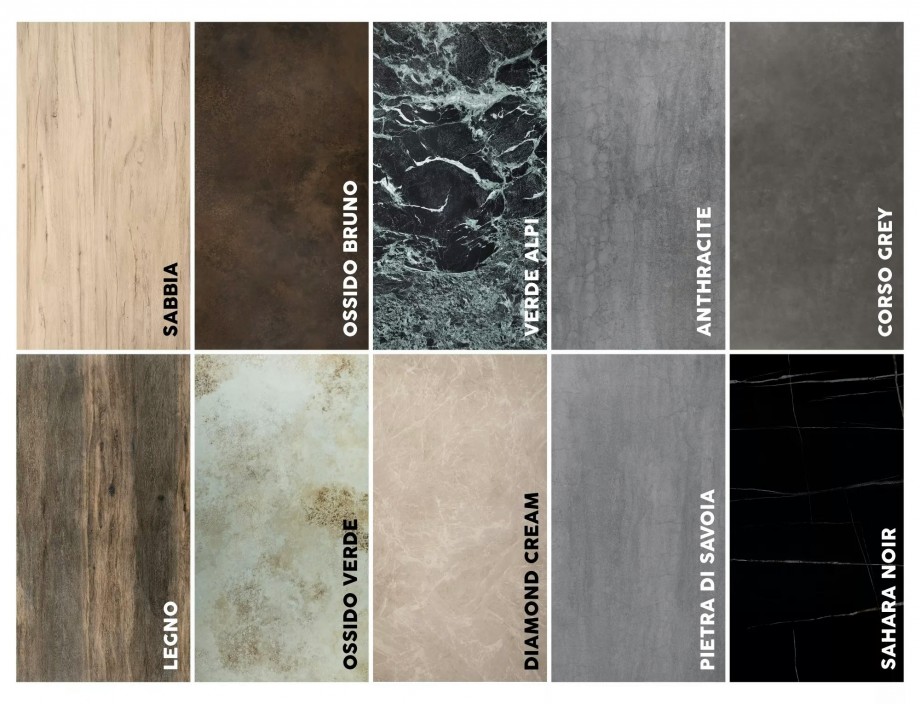 Поверхность столешницы: закаленное стекло + итальянская керамика Pietra di Savoia, матово-светло-серый