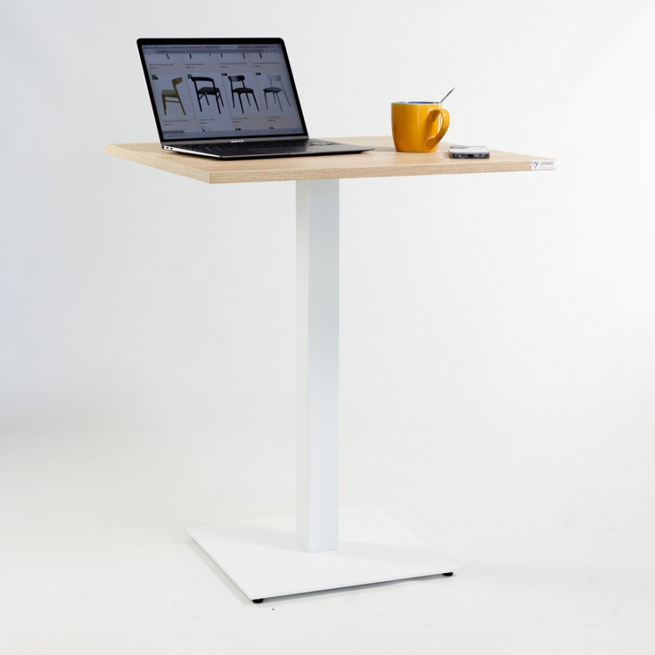 В изготовлении используются надежные и практичные материалы, имеющие долговечное покрытие. Металлическая опора выполнена с порошковой покраской, что делает ее устойчивой к влаге и другим отрицательным воздействиям. Столешница изготавливается из ламинированного ДСП толщиной 18 мм, поэтому имеет привлекательный внешний вид и неприхотлива в уходе.