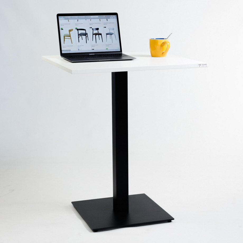 В изготовлении используются надежные и практичные материалы, имеющие долговечное покрытие. Металлическая опора выполнена с порошковой покраской, что делает ее устойчивой к влаге и другим отрицательным воздействиям. Столешница изготавливается из ламинированного ДСП толщиной 18 мм, поэтому имеет привлекательный внешний вид и неприхотлива в уходе.