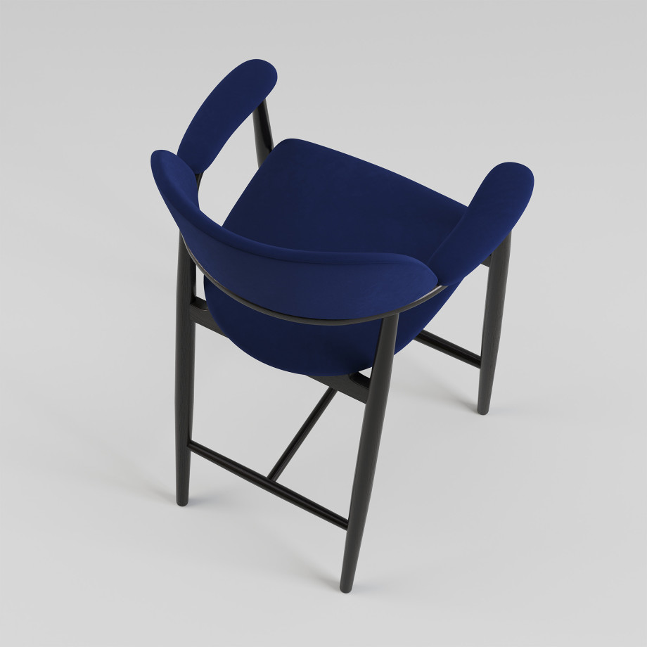 Мягкое сиденье и спинка обеспечивают комфорт при длительном пользовании, а обивка изготавливается на заказ, что позволяет подобрать ткань и фактуру под конкретный интерьер — от кухни и барной зоны до кафе или ресторана. Удобные подлокотники плавно интегрированы в конструкцию, подчеркивая продуманную геометрию стула.