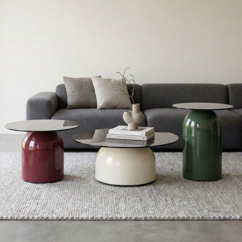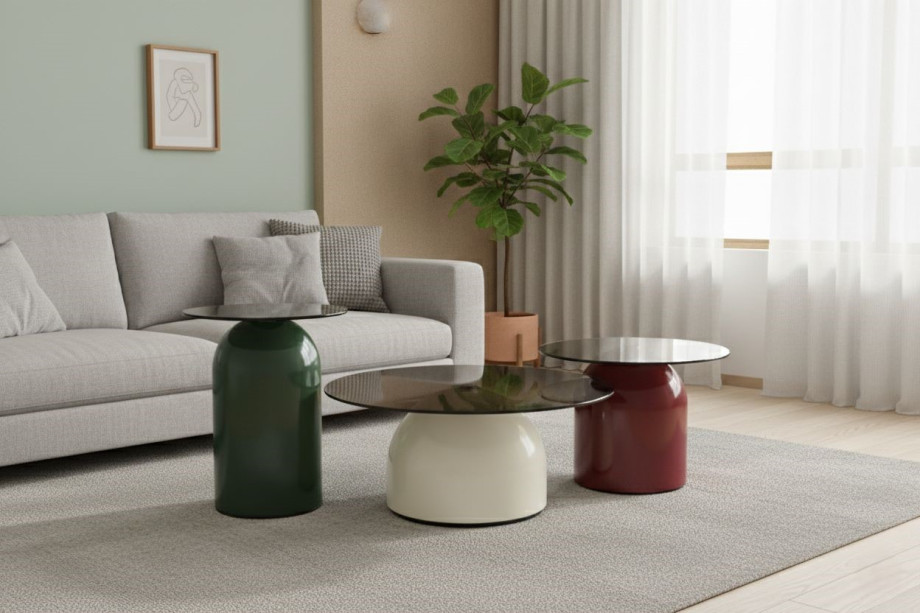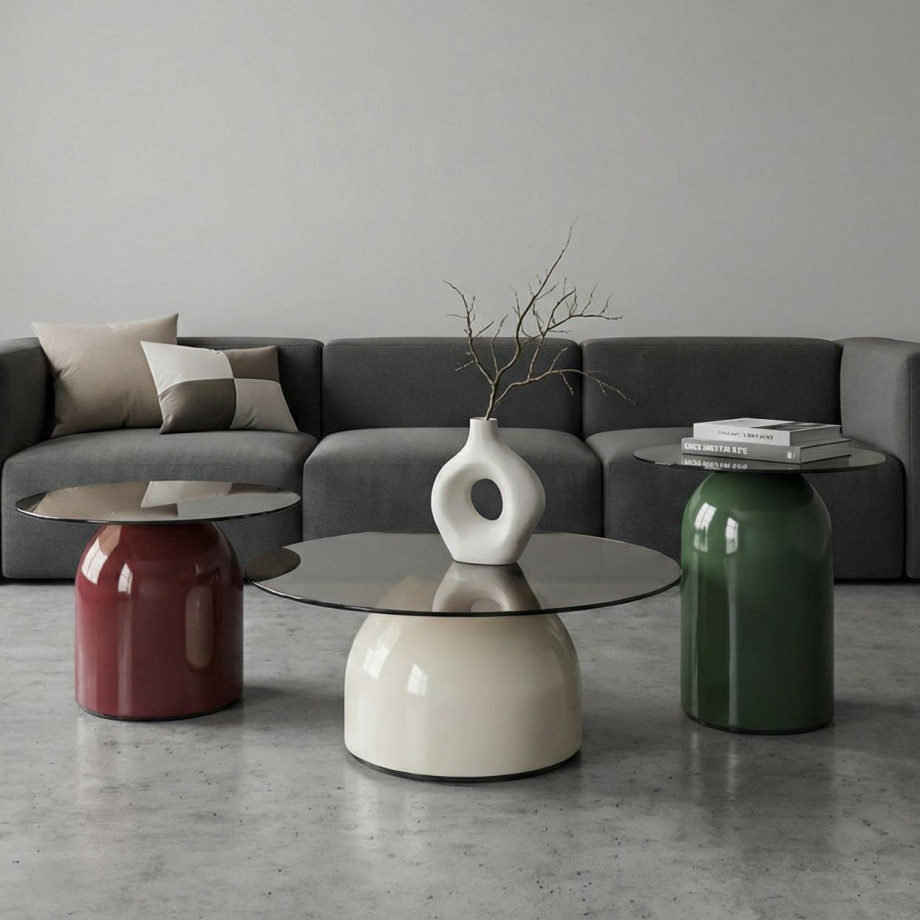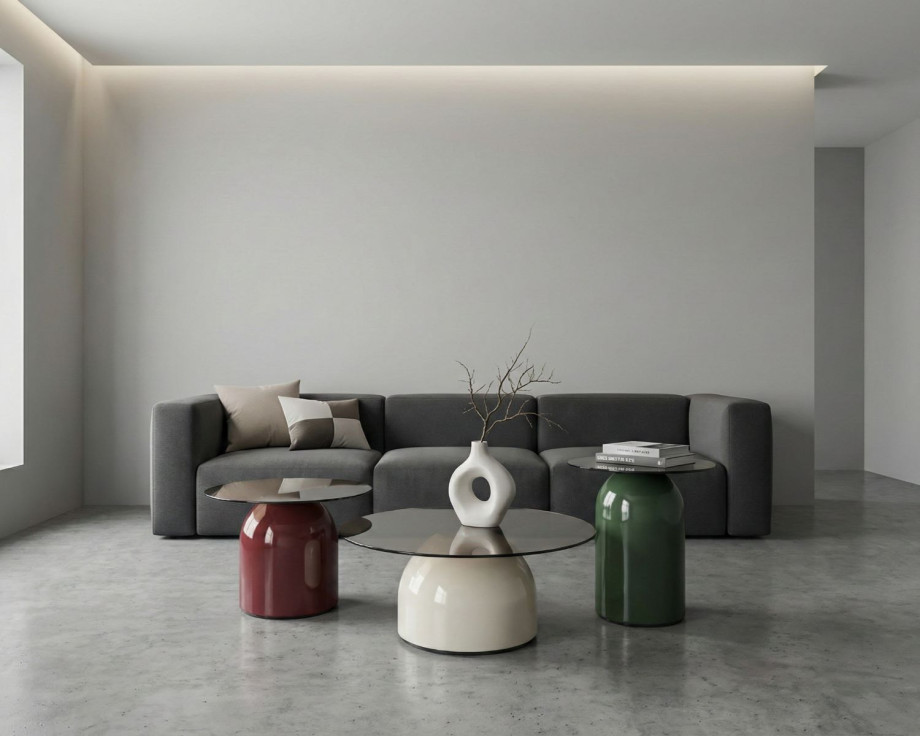 Комплект KENTUCKY со столешницей из закаленного серого стекла выглядит легко и современно. Цветные металлические основания делают интерьер более выразительным.