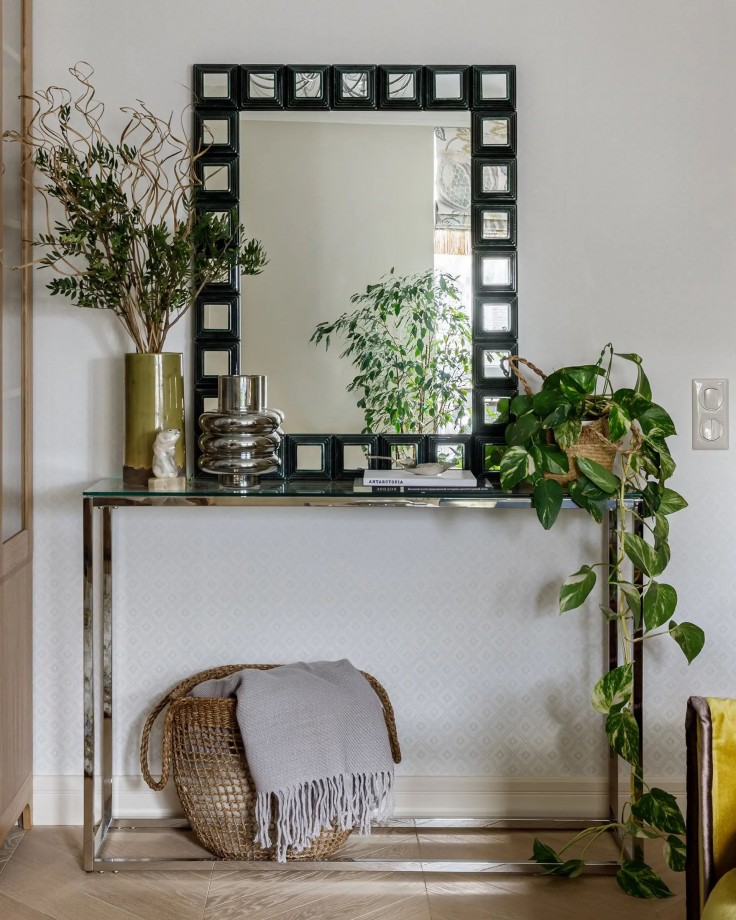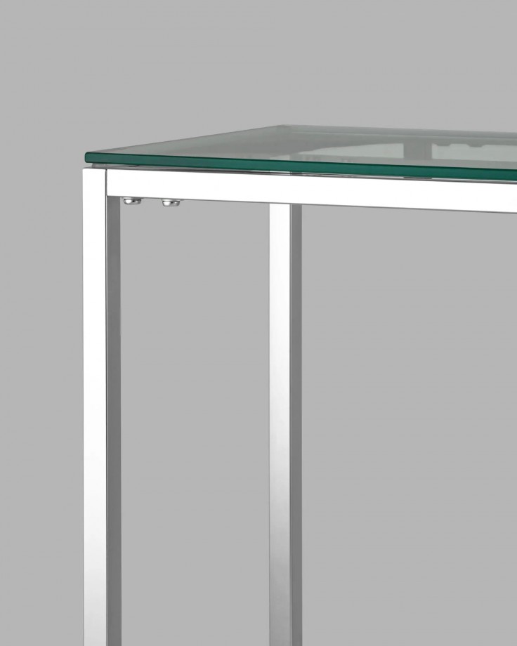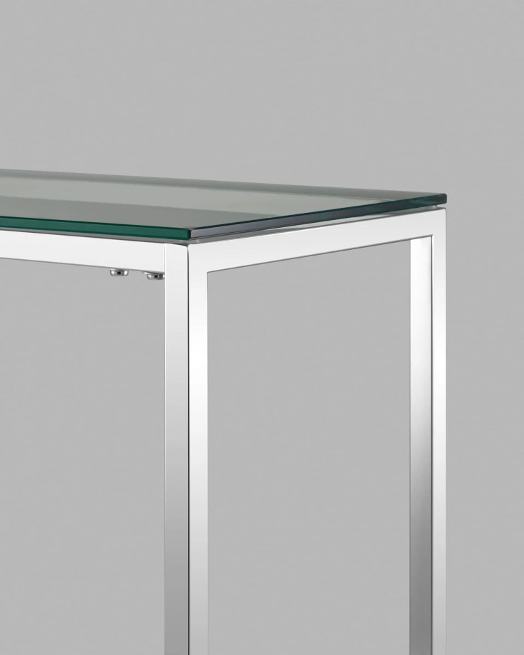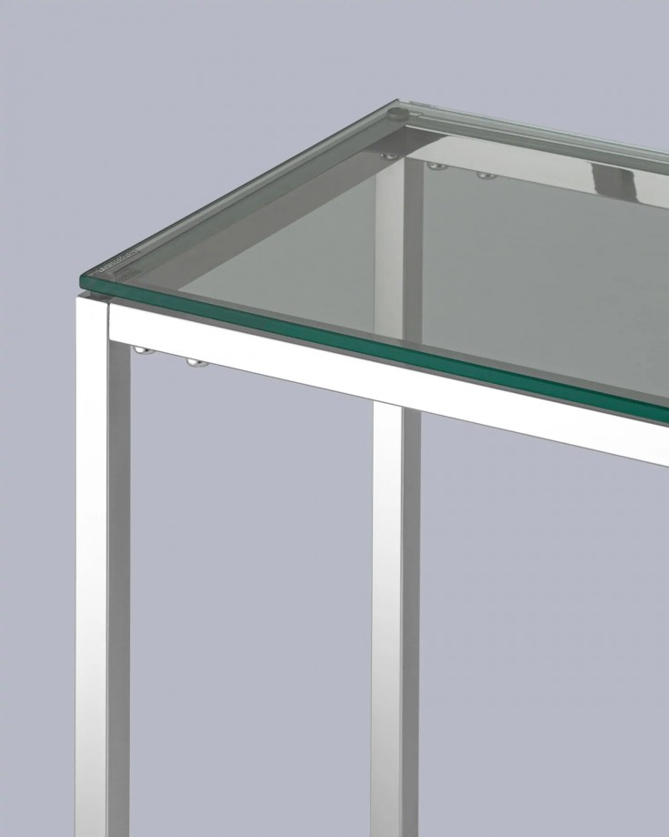одновременно современная и элегантная.Бесцветный прозрачный верх из закаленного стекла и металлический каркас из серебра придают столу гламурности и шика. Идеально подходит как журнальный столик в гостиную, так и как консоль в прихожую.
