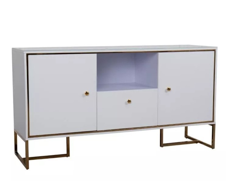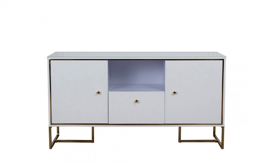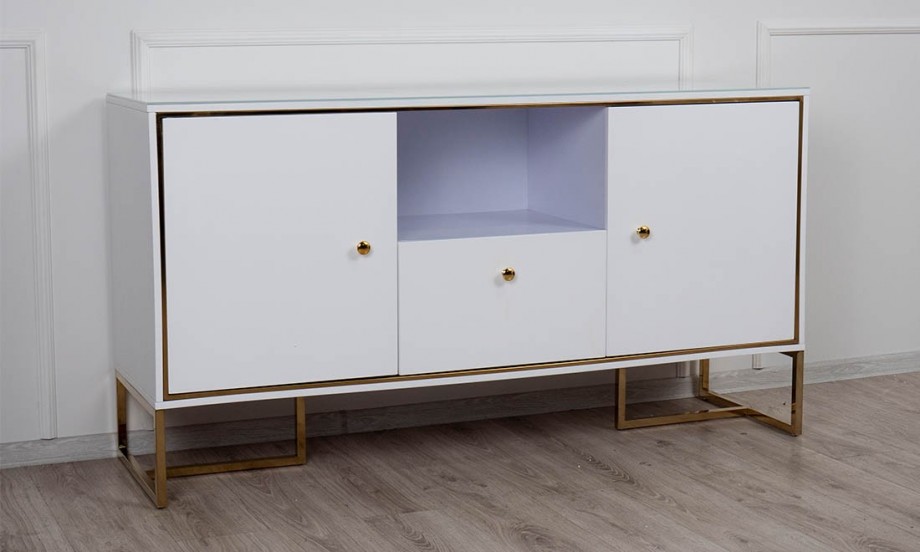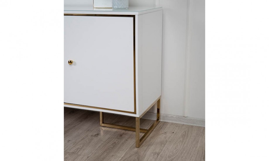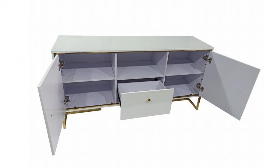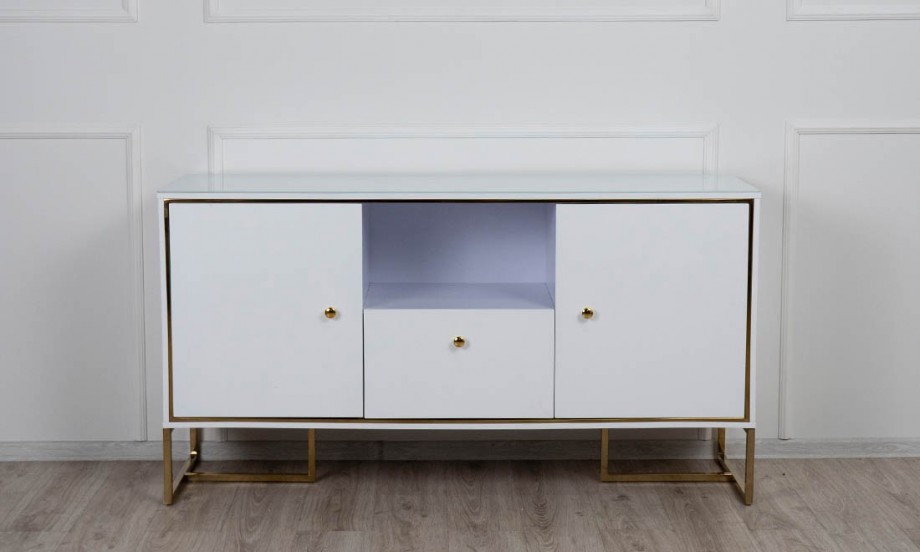 МДФ белый глянцевый, каленое белое стекло на столешнице, ножка из нержавеющей стали золотого цвета (3 круглые ручки: на дверцах и на ящике), 2 дверцы по бокам, выдвижной ящик (с телескопическими направляющими) и полка посередине