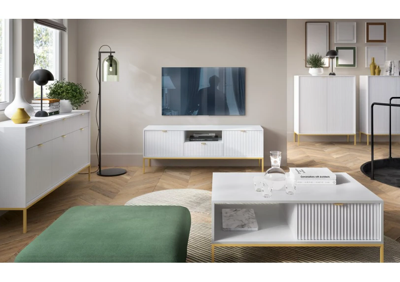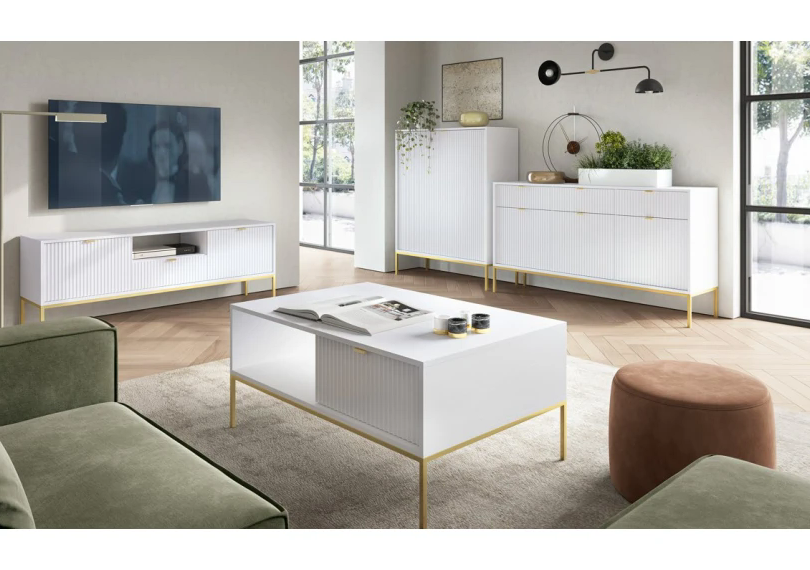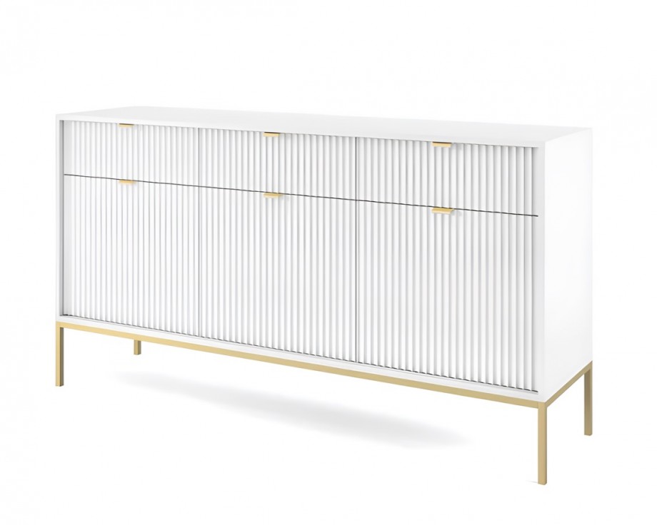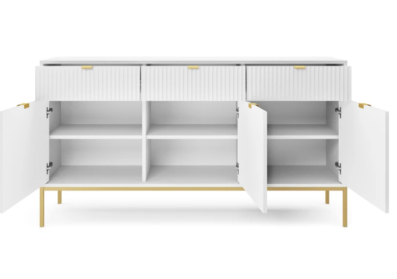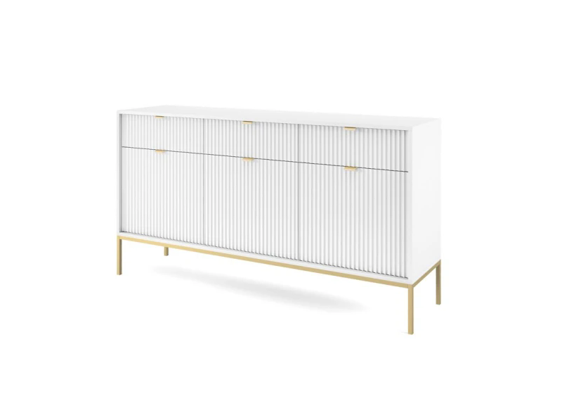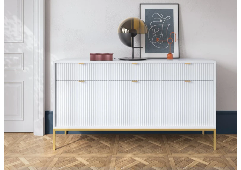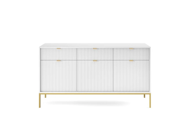 Шукаєте стильний і функціональний меблевий елемент для вашого інтер’єру? Комод Нова з трьома дверцями і висувними шухлядами стане ідеальним рішенням для зберігання ваших речей. Цей сучасний меблевий виріб прекрасно впишеться у стиль лофт, додавши нотку розкоші завдяки золотою обробці на ніжках і ручках. Його елегантний білий колір створює відчуття простору і свіжості.