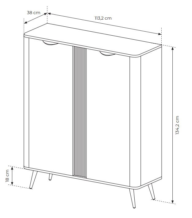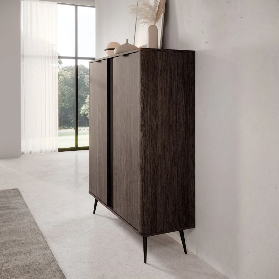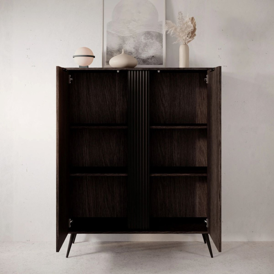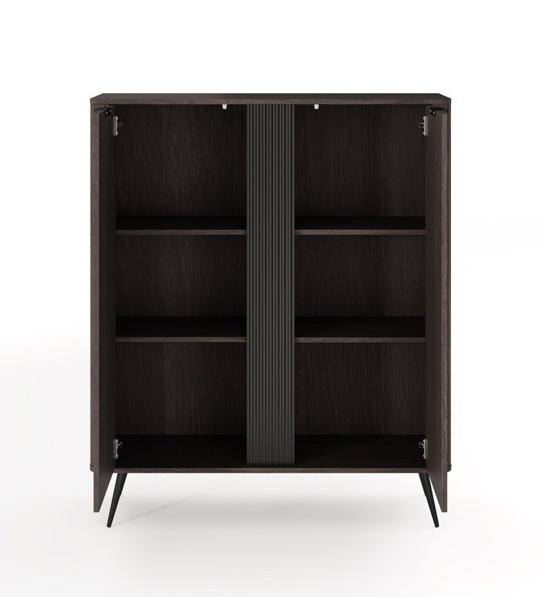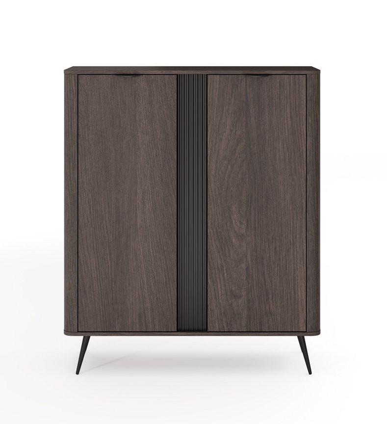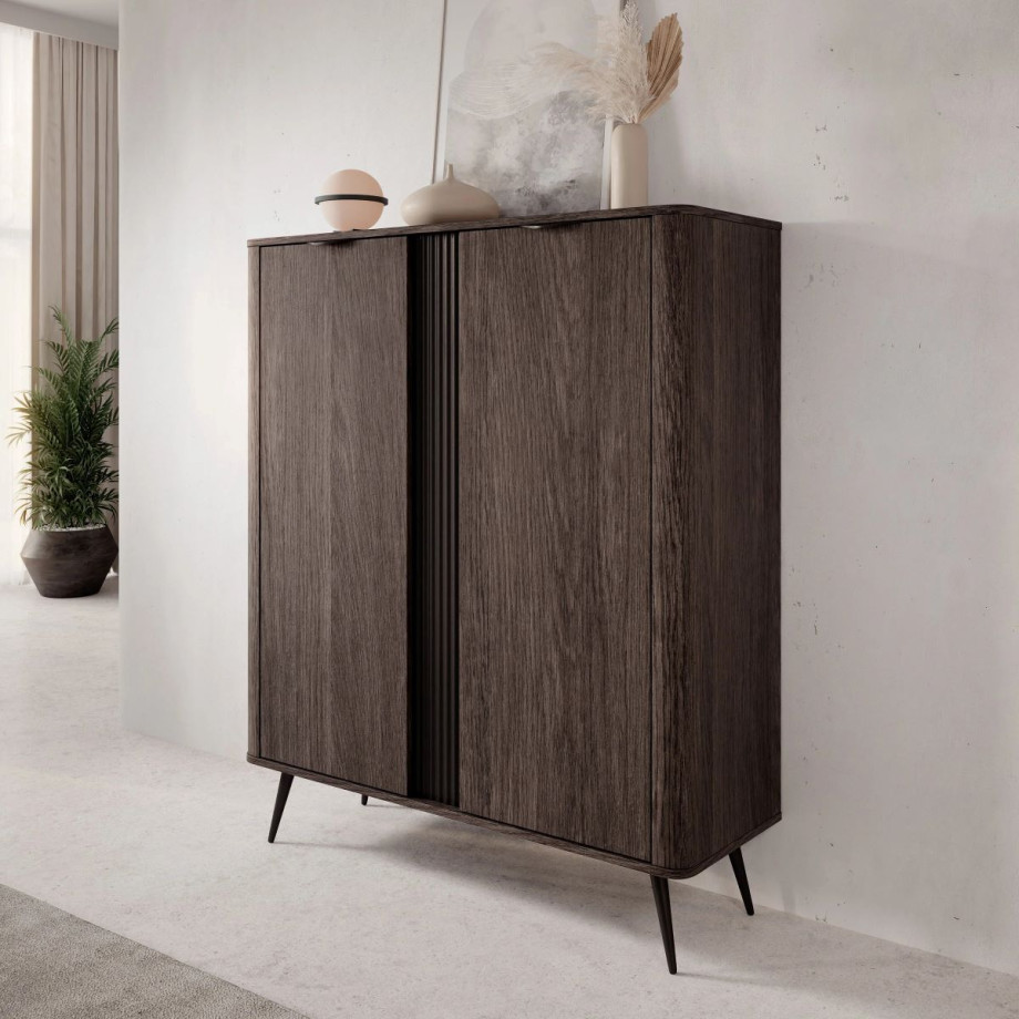 Вертикальний комод Veris 2D 113 у декорі дуб Дунин з чорними деталями – ідеальне доповнення для спальні або коридору. Дві дверці відкривають місткі секції для одягу або дрібних предметів.