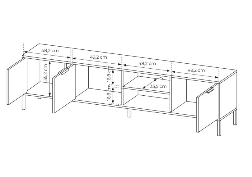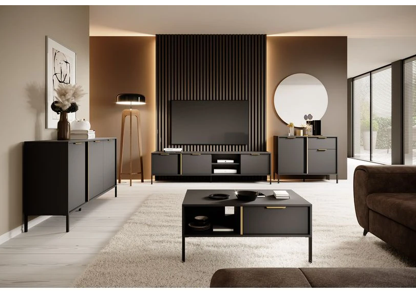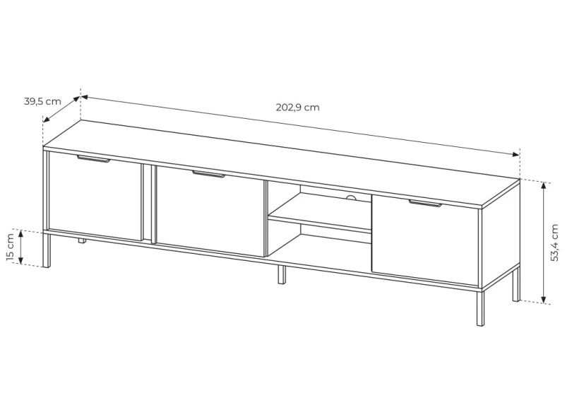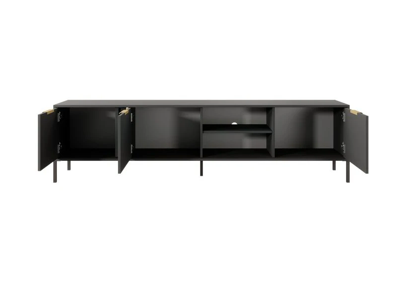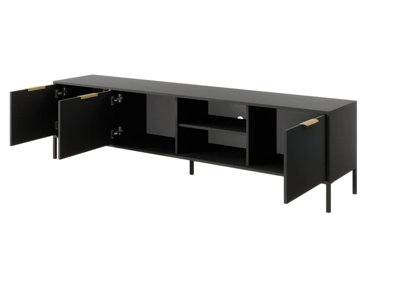Цей елегантний предмет меблів обладнаний трьома розпашними дверцятами для зручного доступу до ваших речей та прекрасною нішею з полицею для зберігання медіапристроїв, колонок і інших аксесуарів. Високі чорні металеві ніжки надають додаткову легкість та престижності, роблячи всю конструкцію ще більш привабливою.