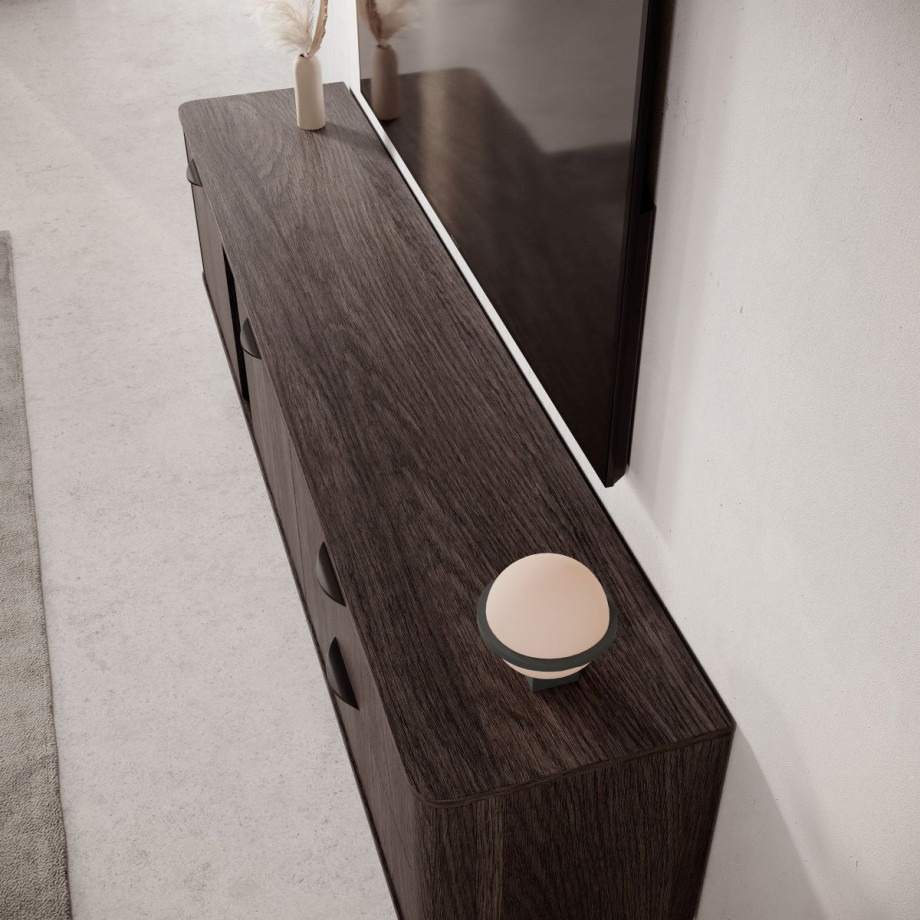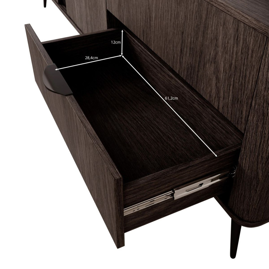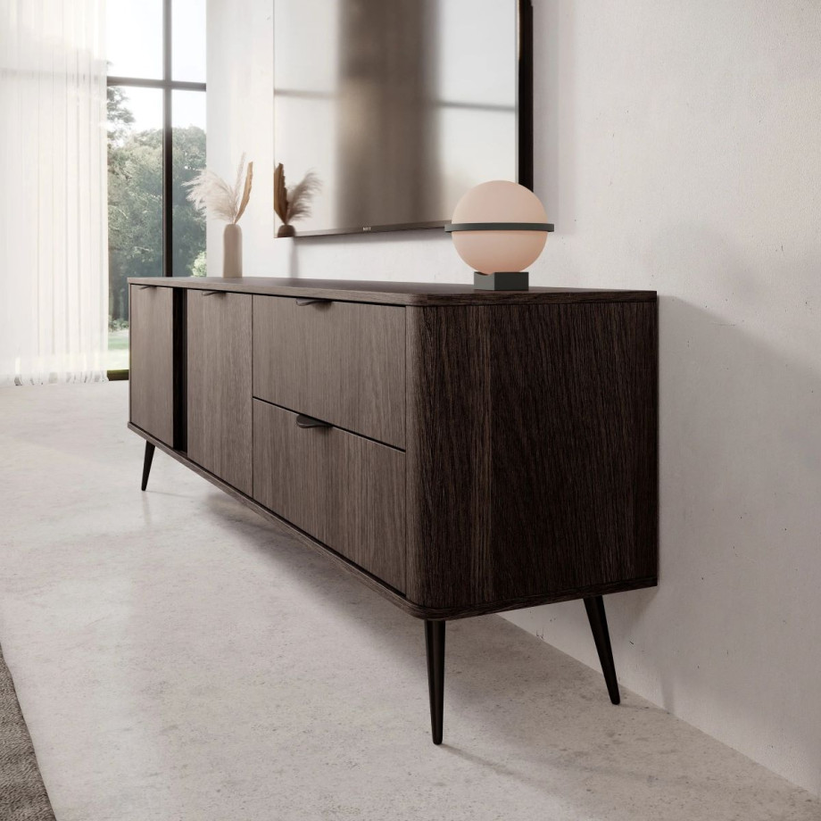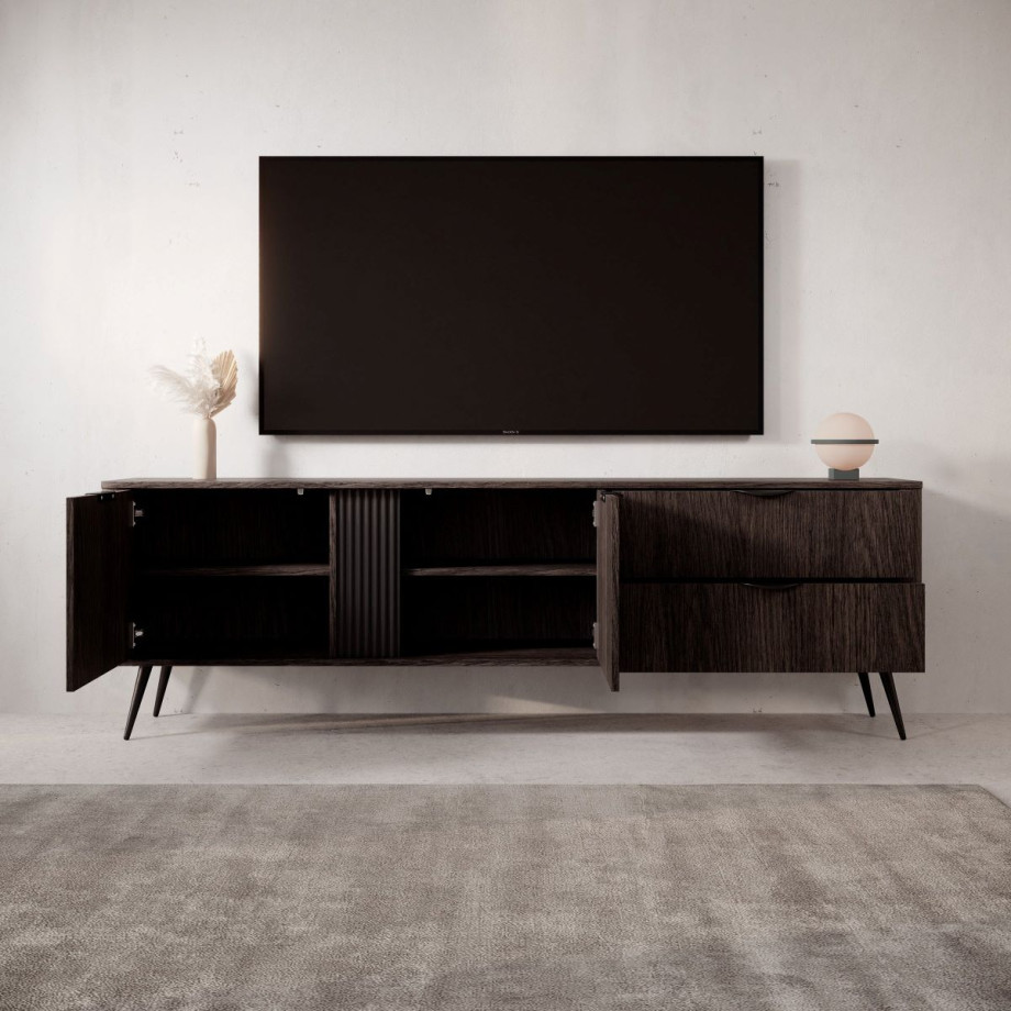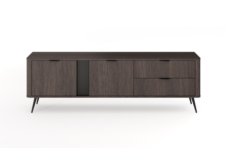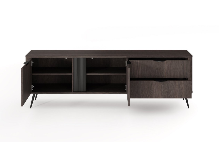 Тумба має дві місткі шухляди та дві закриті секції з полицями, що забезпечує зручне розташування електроніки, пультів та аксесуарів. Металеві ніжки й чорні ручки роблять дизайн сучасним і легким, а обробка ABS-країв підвищує зносостійкість.