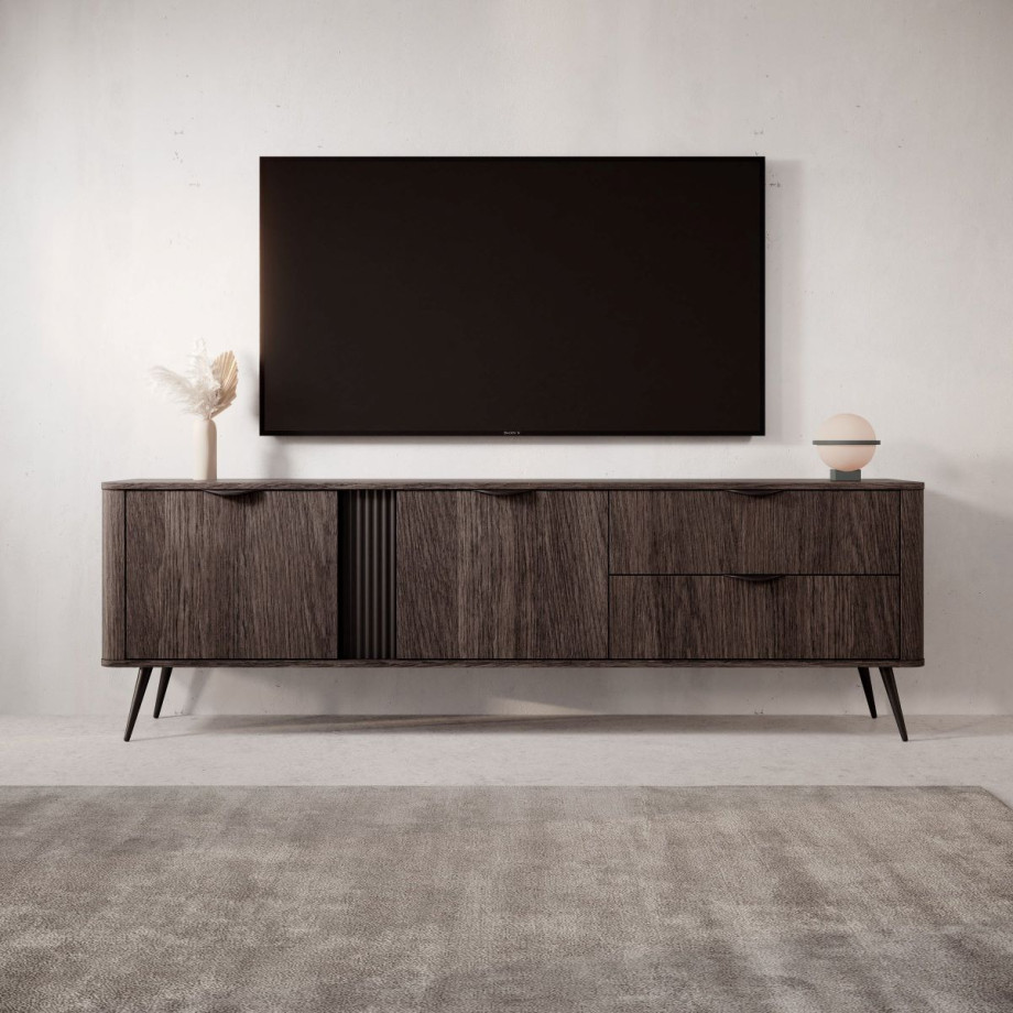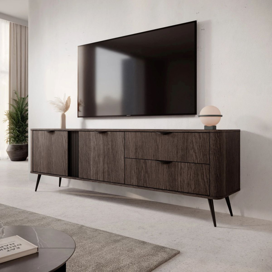 Тумба під телевізор Veris 2D2S 195 у кольорі дуб Дунин з чорними металевими елементами – ідеальне рішення для сучасного вітальні. Просторий верх для телевізора, поєднання натуральних відтінків деревини і чітких контурів підходить під мінімалістичні та лофт-інтер’єри.