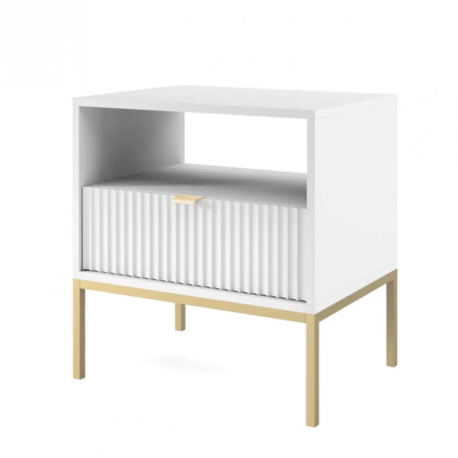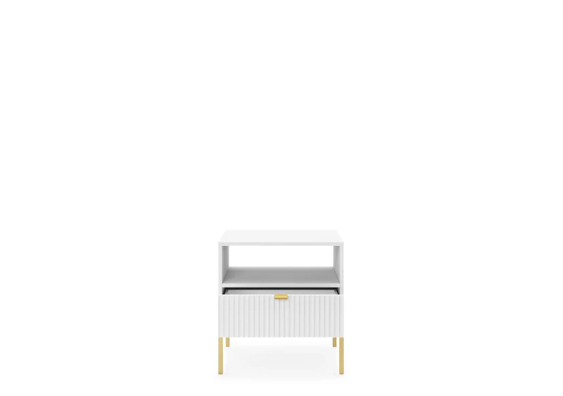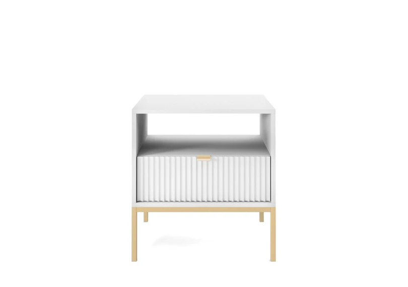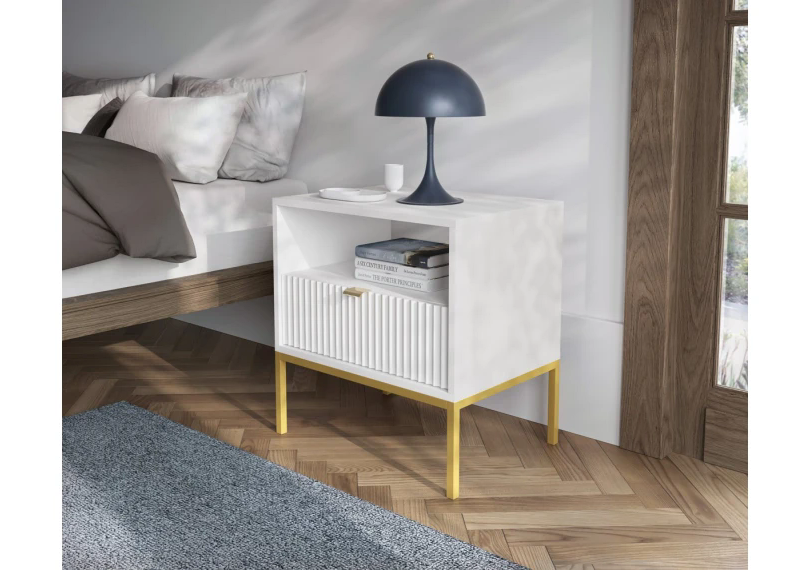 Тумба приліжкова Нова з 1 шухлядою та золотими ніжками – це ідеальна деталь для сучасного інтер'єру. Виготовлена з якісних матеріалів, вона не лише ефективно доповнить ваше приміщення, але й стане відмінним місцем для зберігання ваших речей. Її ніжки з металу в кольорі золото додають елегантності, а білий колір корпусу робить цю тумбу універсальним вибором для будь-якої спальні.