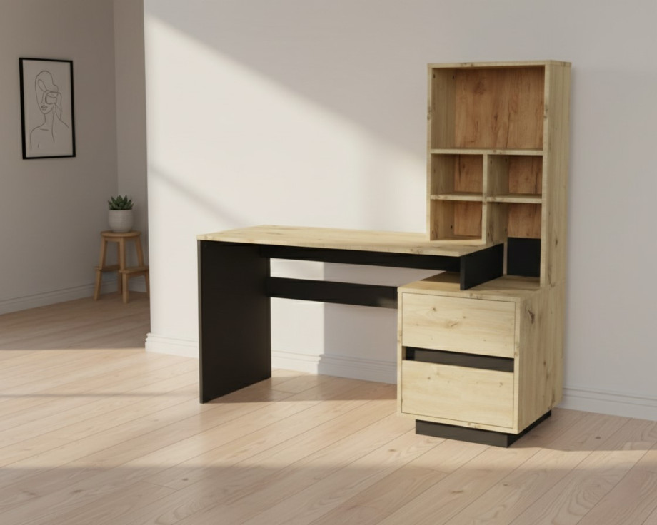 Комп'ютерний стіл у стилі Дуб артізан із чорними елементами - це ідеальне рішення для вашого робочого простору. Цей функціональний і стильний предмет меблів не тільки надає комфортне місце для роботи, а й органічно вписується в будь-який інтер'єр, додаючи нотки сучасних тенденцій. **Основна перевага** - це ідеальний баланс між практичністю та елегантністю, що робить його найбільш затребуваним серед покупців.