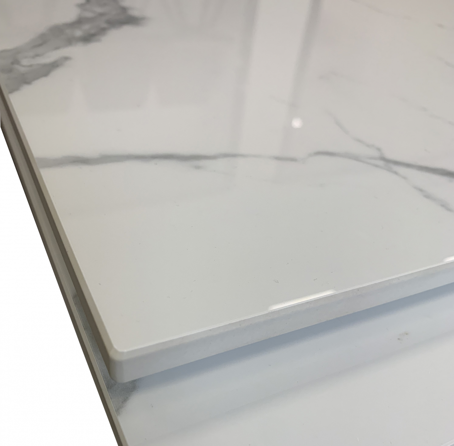 Стільниця і бокові панелі: керамікаСтільниця і додаткові вставки зроблені з керамічної плити білого кольору, що імітує малюнок натурального каменю. Кожен стіл унікальний завдяки малюнку керамічної стільниці. Керамічна плита має товщину 11 мм. Керамічна стільниці має глянсову поверхню. Однією з основних переваг є підвищена стійкість до подряпин і стирання. Стільниця з кераміки стійка до перепадів температури і хімічного впливу. Її легко чистити, вона дуже гігієнічна, тому що не вбирає рідини і не виділяє шкідливих речовин.