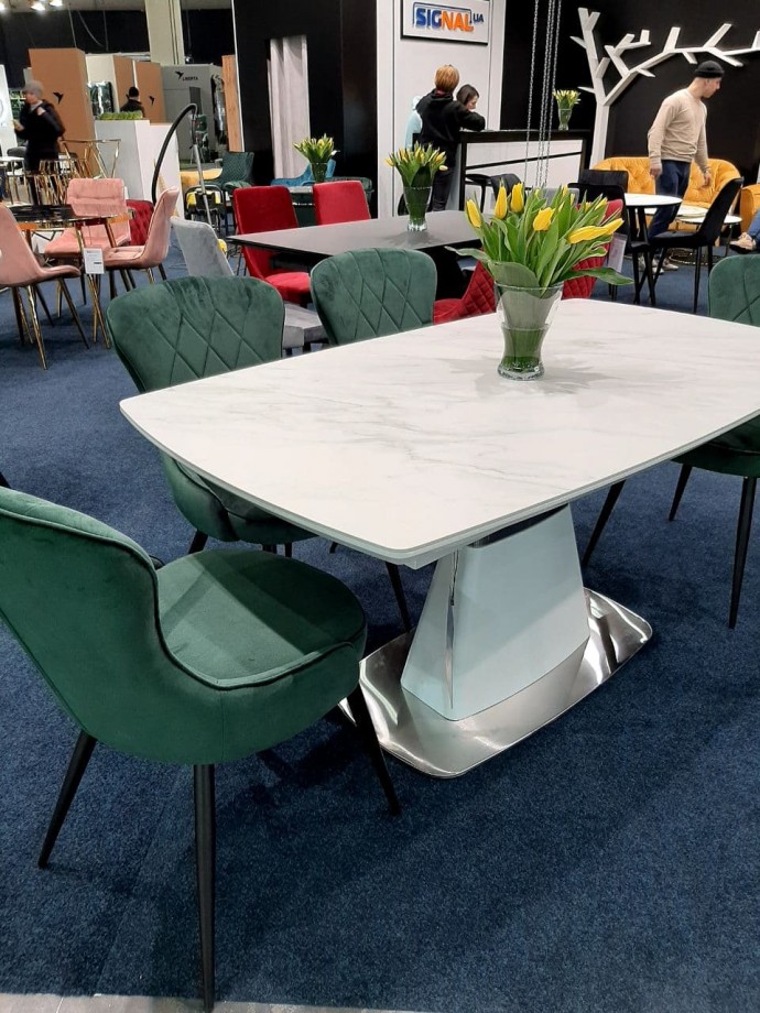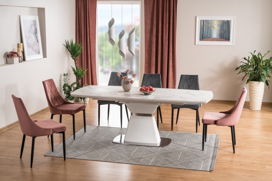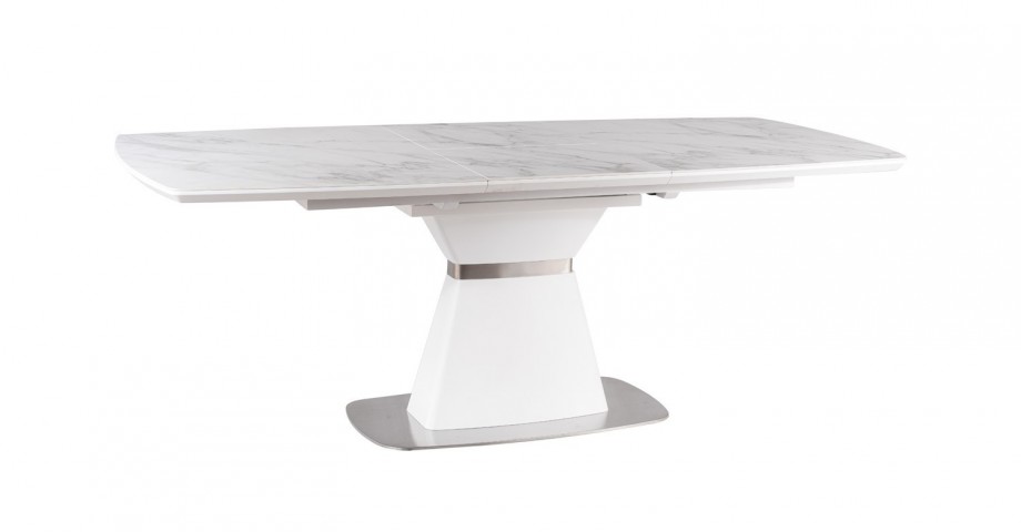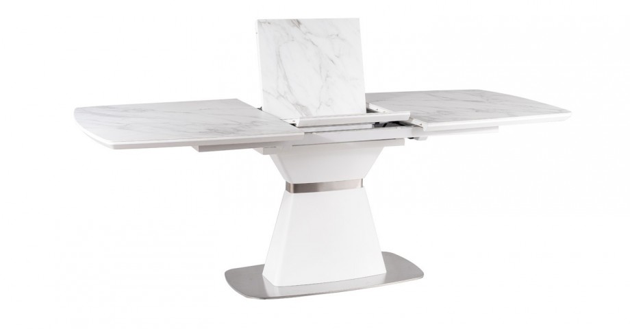 Розкладний стіл від Signal Meble - це пропозиція для людей, які цінують сучасну форму та функціональність. Тонка гармонія білого кольору гармонує з аксесуарами з нержавіючої сталі, роблячи все це чудовою прикрасою сучасної кухні та їдальні в скандинавському або гламурному стилі. Стільниця виготовлена з міцної МДФ плити в поєднанні з керамікою з мармуровим ефектом. Конструкція столу спирається на декоративну матову сталеву основу. Витончена елегантна обробка робить цей надзвичайний предмет меблів унікальною пропозицією для будь-якого розташування.