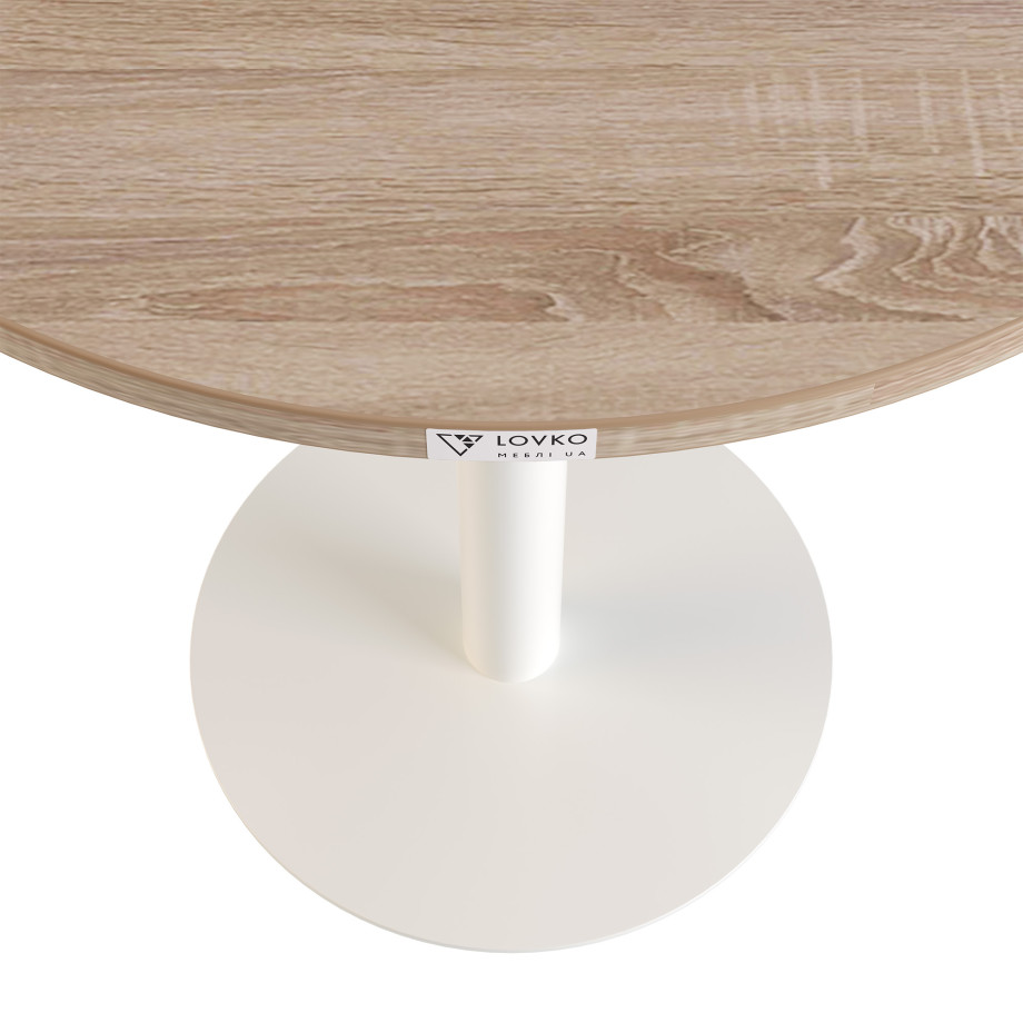 У виробництві застосовуються виключно екологічні та натуральні матеріали. Стіл виконаний з круглою стільницею з ламінованого ДСП. Вона має легкий вигляд і не перевантажує простір, а завдяки використанню спеціальної технології виходить ще й досить міцною. Опора з металу має порошкове фарбування, яке робить її стійкою до різних негативних впливів.