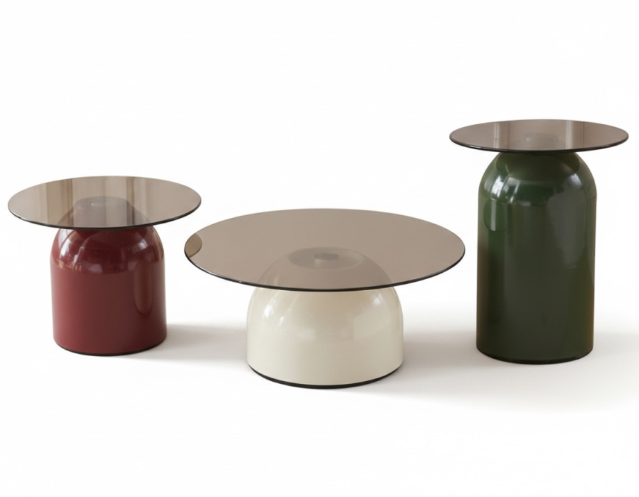 Комплект KENTUCKY із загартованим сірим склом та кольоровими металевими основами створює сучасний акцент у вітальні.